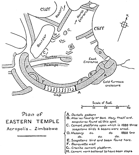 The writer is now perfectly assured that no burial-places of the original builders will be found under the interior of the Elliptical Temple or within 30 yds. of the exterior. Holes have been sunk at regular intervals within the temple and immediately outside the walls, and boring-rods have been systematically employed, and the position and lie of the formation rock ascertained throughout, so that sections and levels have been made of the soil and rock under the temple. All the results gained from each hole and boring are recorded. But beyond discovering buried foundations at the higher level, only virgin soil, never before disturbed, was gone through. French and German archæologists who visited Zimbabwe during the operations confirmed what British scientists have affirmed, that no burials of people of Semitic stock would be found within or near to any building so frequently in use as the great temple must have been. The severe restrictions with regard to cleanliness and sanitation, especially as to the dead, are among the most notable features of the old Semitic nations.