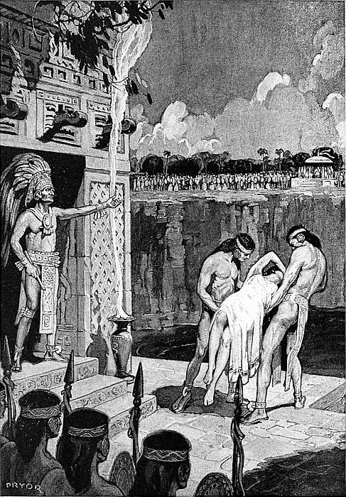On came the pilgrims, heralded by groups of children and women singing and chanting words of welcome. At the feet of the pilgrims were strewn clusters of flowers and along the way were bowls of incense, so that the fragrant smoke pleased their nostrils. First came the priests and the nobles. Then came the lovely maidens chosen to be the messengers to the great god at the bottom of the Sacred Well, and these girl brides of the god were carried upon litters richly adorned and smoothly transported by trained bands of bearers. After them came the devotees, their arms filled with rich offerings. And last came captive warriors, men of fighting renown, esteemed for their valor to be worthy of sacrifice to the Rain God.