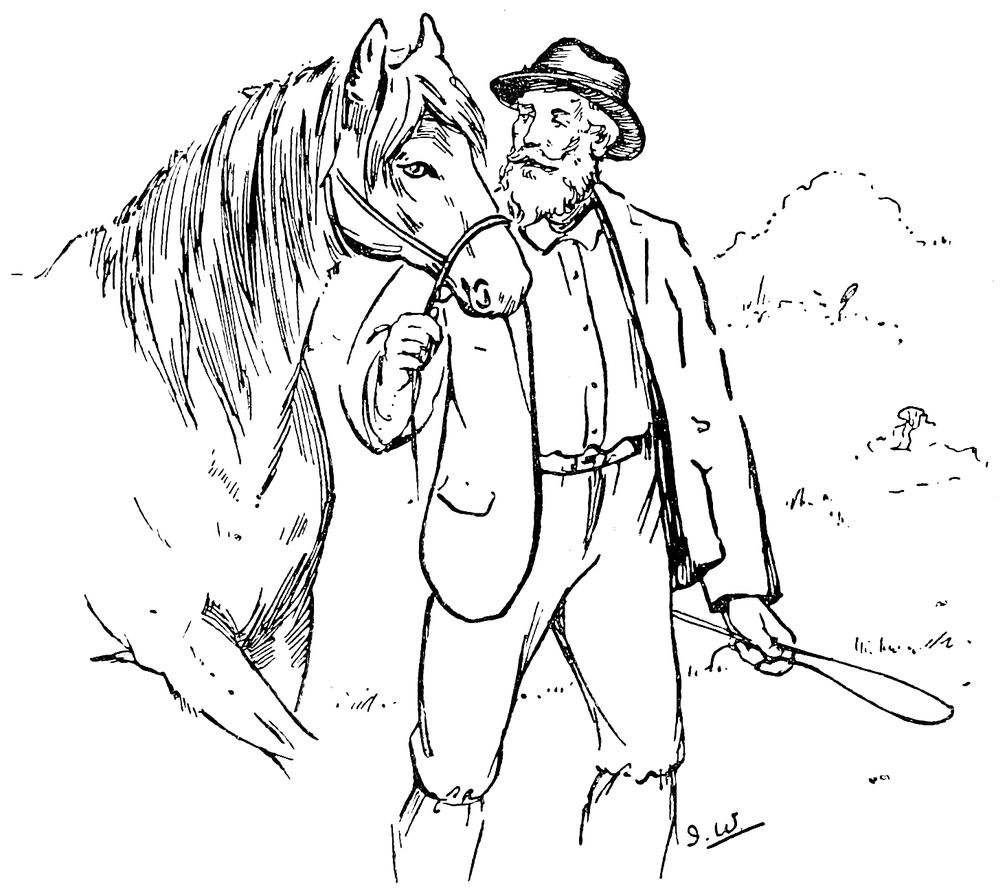 “Shoo! Snowie, my lass, come, yer going to leave yer old master and live with quality now. I know ye’ll behave yerself. It’s Bob what’s botherin’ me.” Here he began towselling the brown pony. “Mind when yer gets to yer new sitewation ye behave yerself, yer little varmint. No monkey tricks there, my man. No sly ways. 56You’ve both worked well for me, and I’ve done the best I can for yer both. I’ve sold yer to Squire Morton, and given yer first-class characters. So don’t go and disgrace yer old master—good-bye!”