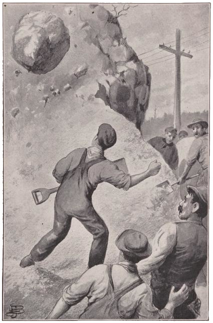 “He’s th’ lazy hound that Jack fired from th’ gang this mornin’,” answered Reddy, his blue eyes blazing with unaccustomed wrath. “He’s a reg’lar bad ’un, he is. We used t’ think he was workin’ like anything, he’d git so red in th’ face, but come t’ find out he had a trick o’ holdin’ his breath t’ make hisself look that way. He was allers shirkin’, an’ when he had it in fer a feller, no trick was too mean or dir-rty fer him t’ try. Y’ remimber, boys, whin he dropped that rail on poor Tom Collins’s foot?”