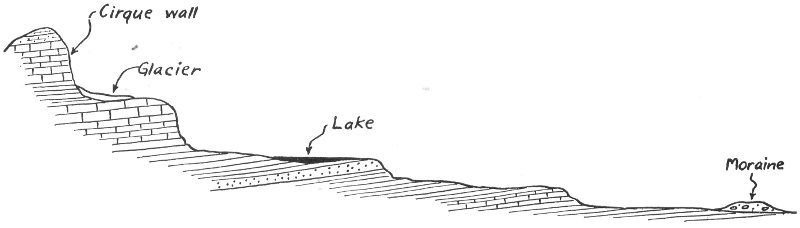 FIGURE 1. IDEALIZED SKETCH OF A GLACIAL STAIRWAY FROM THE ARETE AT THE CENTER OF THE RANGE TO THE ICE AGE MORAINE AT THE MOUTH OF THE VALLEY.