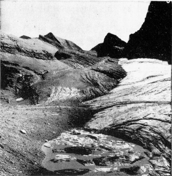 A few glaciers have disappeared within recent years, but their moraines remain as evidence of former glacier activity. One of the most notable examples is afforded by Clements Glacier, a small body of ice which existed until about 1938 in the shadow of Clements Mountain at Logan Pass. Its edge was bordered by a ridge-like moraine nearly a hundred feet high. Today, the trail from Logan Pass to Hidden Lake skirts the outside edge of the moraine. Should the hiker leave the trail and climb the few yards to the top of this moraine he could see it stretched out before him as a giant necklace encircling the base of Clements Mountain, but between mountain and moraine, where a few years ago the glacier lay, he will see only bare rock or drifted snow.
