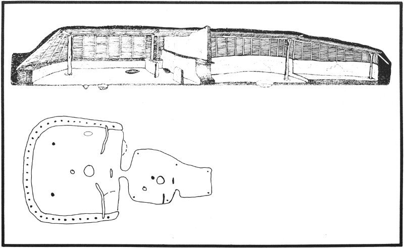 The reconstruction (top) is based on the position of support post holes and other features on the floor plan (bottom).