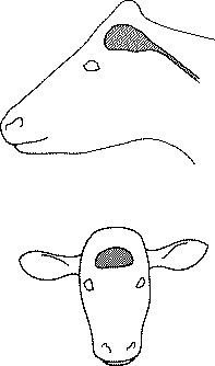 It is best to have the animal secured to a tree or strong post. Direct the bullet at the intersection of two imaginary lines extending from the right edge of the poll to the center of the left eye and from the left edge of the poll to the center of the right eye as shown in figure 4.