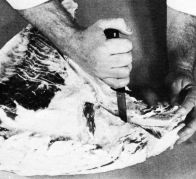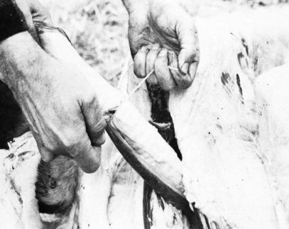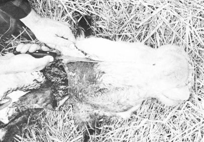 The easiest and safest method for quick bleeding is to bleed the animal while it is still on the ground. Standing behind the animal, grasp the lower jaw (fig. 5), pull the head back slightly, and cut across the throat from ear to ear as deeply as possible (fig. 6). If the blood does not flow freely, cut deeper. A sharp skinning or boning knife is appropriate for this part of the operation.