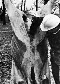 Split the warm, dressed carcass into halves. This allows for free circulation of air around the halves, to get a quicker chill. Also, a dressed beef carcass is heavier and harder to handle if it is not split.