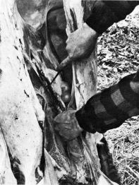 “Pumping” the animal will assure more complete bleeding. This can be accomplished by lifting the hindquarter with the tail, pulling the foreleg, and applying a pumping motion with a foot in the flank (fig. 7).