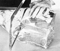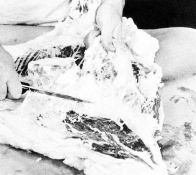 Split the pelvic bone by first locating the seam between the rounds, then following this seam to the bone and cutting through the bone with a knife or saw (figs. 41 and 42).