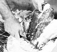 Remove the cheek meat from each side of the jawbone by cutting close to the bone and down to the rise of the bone just over each eye (fig. 28). Wash thoroughly in clean water and put it in ice or ice water.