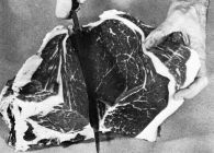 The trimmed hindquarters should be laid on the table with the split surface of the backbone down. Starting at the smaller end of the hindquarter, the club, T-bone, porterhouse, and sirloin steaks are removed by cross-sectional cuts with knife and saw (fig. 111). The last sirloin steak is determined by the cut that passes through the hip joint (fig. 112).