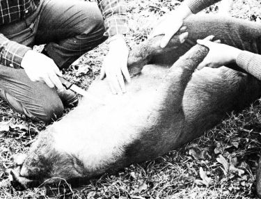The animal should be killed as quickly and humanely as possible. In most slaughter plants, hogs are immobilized either by electrical stunning or carbon dioxide gas suffocation. On the farm a hog can be stunned by striking it one sharp blow with a mechanical stunner or by shooting it in the forehead midway between and slightly above the eyes. The first attempt should be successful (fig. 2). Improperly placed bullets could cause the animal much pain and injure helpers or other livestock. Animals that become excited during stunning will not bleed as well as those less excited. As always the case whenever using firearms, exercise all appropriate safety precautions.