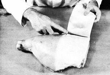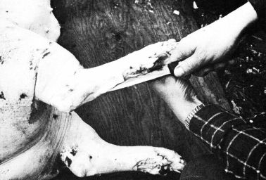 Cut the hide around the rear legs, just below the dew claws (fig. 18). Make a cut through only the hide, down the back of the leg, over the hocks, and to the midline at the center of the hams (fig. 19). Skin around each side of the leg, removing the hide to a point below the hock (fig. 20).