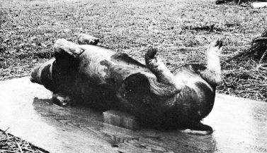 After stunning and bleeding the animal, move the carcass to the location of the hoisting equipment. Place the carcass on a sheet of plywood, a concrete slab, or straw. Wash the blood and dirt from the carcass. Turn the carcass on its back and hold it in place with blocks placed on each side (fig. 17).