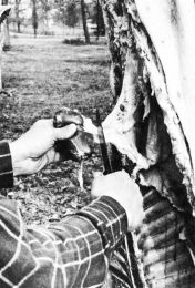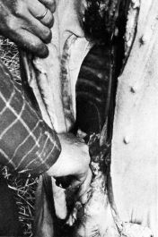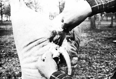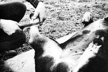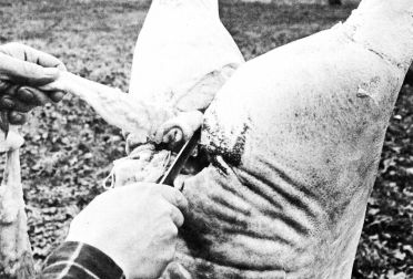 Scrape the hot carcass as quickly as possible because the skin tends to “set” as it cools. If patches of hair and scurf are difficult to scrape, cover them with a burlap bag and pour hot water over them. Scraping is made easier by moving the legs or the head in order to stretch the skin, smoothing the wrinkles along the sides.