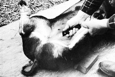 Open the hide down the midline from the point where the animal was stuck, around each side of the pubis area and continue to the anus (fig. 21). Make this cut by inserting the point of the knife under the skin with the blade turned up. This procedure is referred to as cutting from inside out and protects against meat contamination from materials on the hide. Avoid cutting too deeply because you may puncture the intestine and contaminate the carcass.