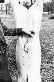 Slaughter site selection is extremely important. The amount of space and equipment needed will depend on the method (scalding or skinning) used. If the carcass is to be scalded, be sure that a site is selected where a fire can be built, and clean, running water is available. If a tree is to be used to suspend the carcass, select a healthy limb, 6 to 8 inches in diameter and 8 to 10 feet from the ground. This will ensure that the limb will not break from the weight of the carcass, and the carcass can be fully extended above the ground for viscera removal and splitting. If the animal is to be slaughtered in a building, be sure that a strong beam 8 to 10 feet from the floor is available. The floor should be clean and, preferably, concrete.