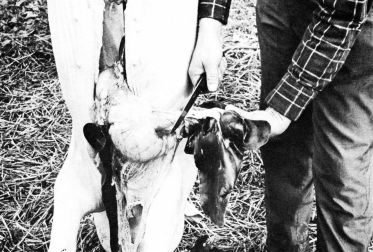 If the head is to be saved, skin over the poll and down the face (fig. 34). Remove the hide at the snout. Remove the front feet by sawing just below the knee joint (fig. 35). Continue with evisceration and splitting.