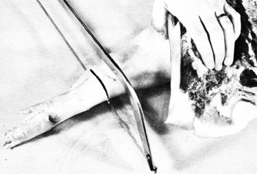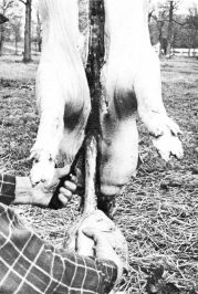 The carcass is now ready to be suspended. Clean the feet by cutting away the soles of the feet and cutting between and around the toes (fig. 12). Expose the gambrel tendons by cutting through the skin on the backs of the rear legs from dew claws to hock (fig. 13). Cut down each side of the tendons, being careful not to cut the tendons (fig. 14). Insert the spreader or gambrel under both tendons on each leg. Secure the legs to the spreader bar and suspend the carcass (fig. 15).
