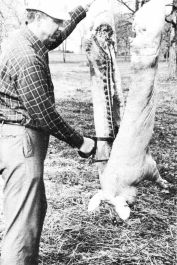 It is important to exercise proper care of the animal prior to slaughter, if you expect to obtain high quality meat. Pen the animal in a clean, dry place the day before slaughtering. Restrict the animal from feed 24 hours prior to slaughter, but provide access to water at all times. The slaughter of hot, excited animals increases the risk of sickness, injury, and darker meat; therefore, do not run the animal or wrestle with it. Bruises and whip marks cause bloody spots which must be trimmed out.