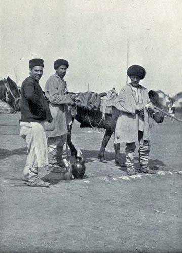 The natives put on their fezzes again, and a delegation of notables bearing a white flag went out to the[270] camp of Bakhtiar Pasha to surrender the town. On their way they were stopped by the soldiers and bashi-bazouks and made to empty their pockets. Further on more Turks, whose rapacity had been less satisfied, demanded the clothes and shoes they wore. Arriving at headquarters of the general, situated on an eminence from which there was a full view of the proceedings, the representative citizens, left with barely cloth to cover their loins, offered a protest along with the surrender. Bakhtiar had their clothes returned to them, and told them he could do nothing with ‘those bashi-bazouks’—though beside him sat Adam Aga, a notorious scoundrel of Prelip, who had brought up the largest detachment of bashi-bazouks, and with whom, subsequently, Bakhtiar is said to have shared the proceeds of the loot.