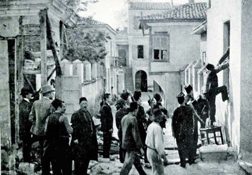 The Greek church was on the market place among the shops. The Turks who were not fortunate enough to get into the church went to work on the stores. Door after door was cut through with adzes, the shops rifled of their contents, and then ignited as the church had been. Two hundred and three shops and three hundred and sixty-six private houses were pillaged and burned, and six hundred others were simply rifled—because the petroleum gave out.