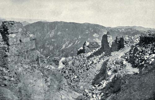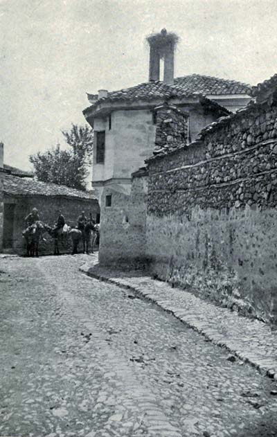 Krushevo was built on rock in a slight depression in the top of a range of mountains. The houses were constructed solidly of stone, with thick slate roofs all cut from the mountain-side. Hilmi Pasha had explained to me that the ‘unfortunate’ conflagration was caused by the explosion of shells, which, he argued, any civilised nation would have employed in capturing the town. Every house in Krushevo was ignited individually. The gates of six hundred houses which suffered only pillage bore the hacks of adzes and axes. Soldiers and bashi-bazouks, holding hands—as Turks do—still lurked about with their adzes in their[273] belts. On the walls, most of which still stood, stains of petroleum trailed down. I entered one house through which two cannon balls had passed. But there was not a mark of flame as a result.