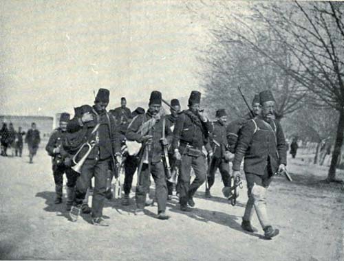 The Turkish guard would certainly be on the watch for the band, so the leader decided to cross the border close to one of the smaller posts, where, he judged, the patrols would be less active, not expecting such audacity. He selected a passing place within earshot of a blockhouse, which could be seen plainly in the moonlight. A sentinel sat in Turkish fashion before the door, wailing a doleful dirge through his nose, a way Turkish sentinels have. To the time of the Turk’s music the insurgent band filed over the border, guns loaded and cocked, bayonets fixed, and arrived in Kustendil, whence to Sofia their march was a triumphant procession.