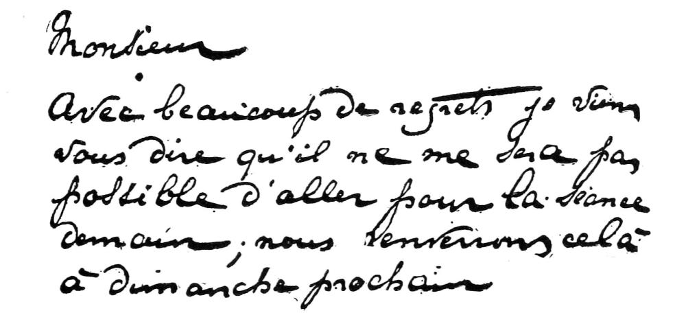 My first idea was, as may be supposed, that Mlle. Smith must some time or other have seen some certificates or documents signed by the syndic or by the curé of Chessenaz, and that it was these forgotten436 visual flashes, reappearing in somnambulism, which had served her as inner models when her entranced hand retraced these signatures. One may likewise imagine how angry such a supposition would make Hélène, who has no recollection whatever of having ever heard the name of Chessenaz nor of any of its inhabitants, past or present. I only half regret my imprudent supposition, since it has availed to furnish us a new and more explicit manifestation of the curé, who, again taking hold of Mlle. Smith’s arm at a later seance (May 21st, at M. Lemaître’s) comes to certify to us as to his identity by the attestation, in due and proper form, of Fig. 43. As is there seen, he makes it twice; being deceived as to the signature, he incontinently, with disgust, crosses out that which he had so carefully written, and recommences on another sheet; this second draft, in which he has omitted the word “soussigné” (“undersigned”) of the first, took him seven minutes to trace, but leaves nothing to be desired as to precision and legibility. This painstaking calligraphy is very like that of a country curé of sixty years ago, and in default of another specimen for comparison, it presents an undeniable analogy of hand with the authentic receipt of the order for payment of money of Fig. 44.