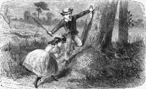 “That is right, Kit. There is a part of Florida, as large, I should think, as the whole State of Massachusetts, which is covered with water. Tall grass and reeds grow up in this water, and occasionally small islands are found, covered with trees and tangled vines. Some of our most beautiful flowering vines, such as the Wisteria, with its purple clusters of blossoms, which you see hanging from the posts of our back piazza, and the sweet-scented jessamine, are brought from those islands which are homes for snakes, alligators, wild boars, and wolves. Indians used often to hide themselves in these Everglades, and come down in their canoes by night and attack the neighboring settlements. In order to protect the lives of the people near, the[Pg 237] United States erected a fort close by, and the soldiers were constantly sent out from it into these Everglades to hunt out the Indians. It was soon found that some other plan must be adopted, for soldiers died rapidly, as those places were filled with a very unhealthy atmosphere called miasma, much like that of the jungles you have heard of in India, where the only paths are those which the wild beasts make on their way to find water. Wolves and tigers hide there in the dark thickets to spring out upon travellers, and huge boa-constrictors hang from the branches of the trees ready to spring down, wind themselves around their victims, and crush them instantly.