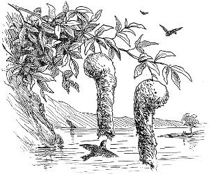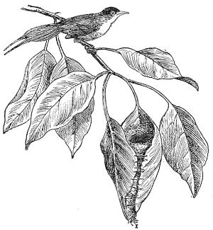 A bird called the grosbeak builds a nest shaped like an inverted bottle with a long neck, through which it passes up to a snug little chamber above. The nest is skillfully constructed of soft vegetable substances, sewed together in a wonderful manner, and suspended from a twig of a bush.