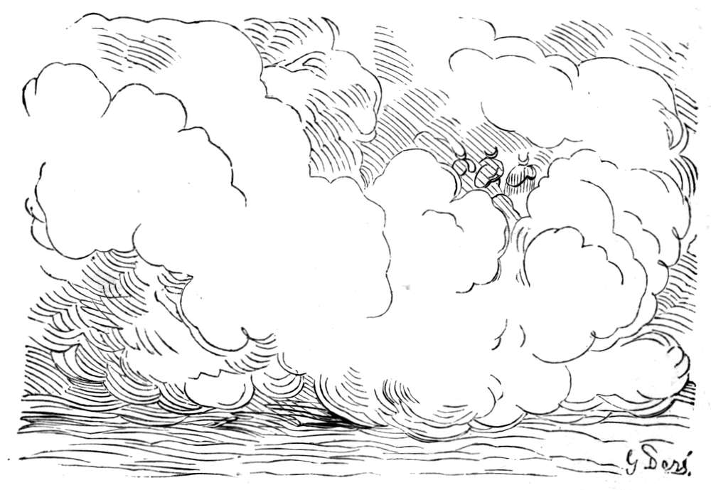 Jeg speidet rundt omkring i alle retninger, men kunde ikke se andet end vand. Forskjellen mellem det klimat hvor jeg nu var, og det som jeg var vant til hos Vulkan, begyndte ogsaa at bli ubehagelig. Tilsidst fik jeg langt borte øie paa en gjenstand som saa ut som en uhyre klippe og som øiensynlig kom imot mig. Jeg saa snart, at det var et isberg. Jeg undersøkte længe førend jeg fandt en revne, ved hvis hjelp jeg kunde komme op. Tilsidst lykkedes det mig dog, og jeg klatret op paa dets top, men til min store ærgrelse kunde jeg her heller ikke opdage land paa nogen kant.