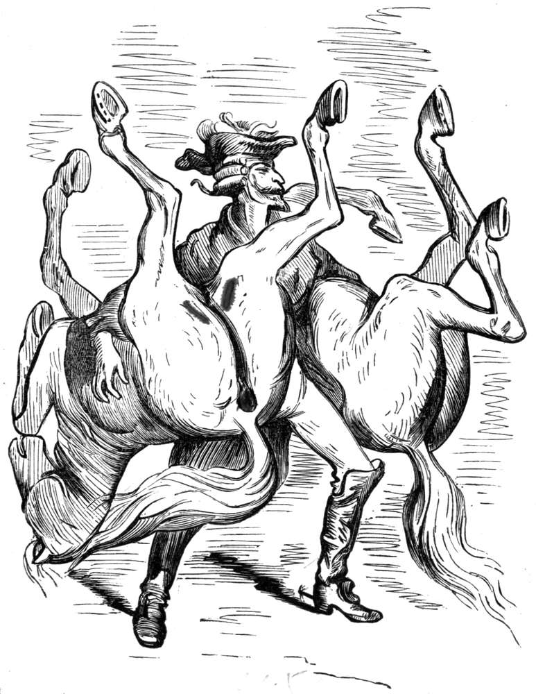 Uten lang betænkning tok jeg en av mine pistoler og skjøt bidslet tversover, saa hesten faldt ned, og saa fortsatte jeg min reise.