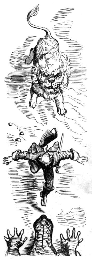Det var ingen utsigt for mig til at slippe fra den, hvorfor jeg la mig ned paa bunden av slæden og lot min forskrækkede hest løpe for livet. Da skede det som jeg hadde ønsket, men neppe hadde turdet haabe. Ulven brød sig ikke det mindste om min ringe person, men satte over mig og anfaldt med raseri hesten, hvis bakdel den øieblikkelig sønderslet og slukte med graadighet. Det arme dyr for i sin skræk og smerte avsted i frygtelig fart. Da jeg saaledes selv var utenfor fare for øieblikket, vovet jeg at løfte hodet og saa med skræk, at ulven næsten hadde ætt sig ind i hestens krop. Det varte ikke længe før den var dypt inde i hestens legeme; men da pisket jeg av alle kræfter paa den bakfra, saa den forvirret skyndte sig at æte sig forover, indtil tilslut hestens kadaver faldt ned paa jorden. I stedet hadde jeg nu faat ulven i sælen, og da jeg brukte pisken saa flittig som jeg kunde, ankom jeg snart mot begges forventning og til tilskuernes høieste forbauselse til St. Petersburg.