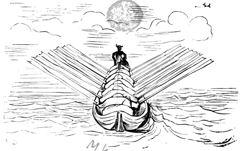 Efter nogen dages seilas, Gud ved i hvad retning, for vi var fremdeles uten kompas, blev vandet rundt omkring os aldeles sort; da vi undersøkte det nøiere, blev vi behagelig overrasket ved at finde at det var den deiligste vin istedetfor skiddent vand, som vi hadde trodd. Det var med største møie vi kunde avholde vort mandskap fra at drikke sig rent fordærvet. Men vor glæde varte ikke længe, for nogen timer efter fandt vi os paa alle kanter omringet av hvaler og andre uhyre store fisker, hvorav en især var saa stor at vi ikke med den allerbedste kikkert kunde se dens hale. Ulykkeligvis opdaget vi ikke uhyret, før vi var like ind paa det, da den med engang drog vort fartøi med fulde seil ind i sit aapne gap.