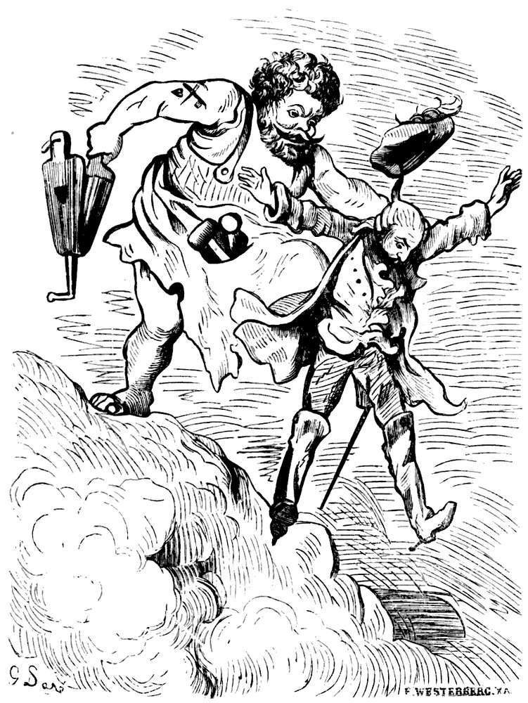 Jeg kunde ikke andet end føle medlidenhet med stakkaren. Skjønt jeg selv trængte haardt til min kappe, kastet jeg den dog over ham og kviknet ham op med noget av min feltflaske. Knapt hadde jeg utført denne kjærlighetsgjerning, før jeg hørte en røst fra skyen: