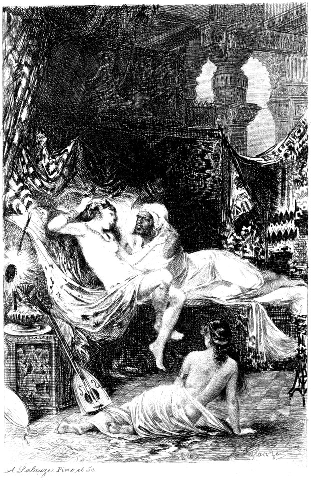 63It is told in various relations of the folk (but Allah is All-knowing of His secret purpose and All-powerful and All-beneficent and All-merciful in whatso of bygone years transpired and amid peoples of old took place) that the Caliph Hárún al-Rashíd being straitened of breast one day summoned his Chief of the Eunuchs and said to him, “O Masrúr!” Quoth he, “Adsum, O my lord;” and quoth the other, “This day my breast is straitened and I would have thee bring me somewhat to hearten my heart and consume my care.” Replied Masrur, “O my lord, do thou go forth to thy garden and look upon the trees and the blooms and the rills and listen to the warblings of the fowls.” Harun replied, “O Masrur, thou hast mentioned a matter which palleth on my palate[107] nor may my breast be broadened by aught thou hast commended.” Rejoined the Eunuch, “Then do thou enter thy palace and having gathered thy handmaids before thee, let each and every say her say whilst all are robed in the choicest of raiment and ornaments; so shalt thou look upon them and thy spirits shall be cheered.” The Caliph retorted, “O Masrur, we want other than this;” whereupon quoth the slave, “O Prince of True Believers, send after the Wazirs and thy brotherhood of learned men and let them improvise for thee poetry and set before 64thee stories whereby shall thy care be solaced.” Quoth he, “O Masrur, naught of this shall profit me.” Hereat cried the Eunuch, “Then, O my lord, I see naught for thee save to take thy sabre and smite the neck of thy slave: haply and peradventure this may comfort thee and do away with thy disgust.”[108] When the King Harun al-Rashid heard these words, he laughed aloud and said to him, “O Masrur, go forth to the gate where haply thou shalt find some one of my cup-companions.” Accordingly he went to the porte in haste and there came upon one of the courtiers which was Ali ibn Mansúr Al-Dimishkí and brought him in. The Commander of the Faithful seeing him bade him be seated and said, “O Ibn Mansur, I would have thee tell me a tale somewhat rare and strange; so perchance my breast may be broadened and my doleful dumps from me depart.” Said he, “O Prince of True Believers, dost thou desire that I relate to thee of the things which are past and gone or I recount a matter I espied with my own eyes?” Al-Rashid replied, “An thou have sighted somewhat worthy seeing relate it to us for hearing is not like beholding.” He rejoined, “O Emir al-Muuminín, whilst I tell thee this tale needs must thou lend me ear and mind;” and the Caliph[109] retorted, “Out with thy story, for here am I hearkening to thee with ears and eyes wide awake, so that my soul may understand the whole of this say.” Hereupon Ibn Mansur related to him
