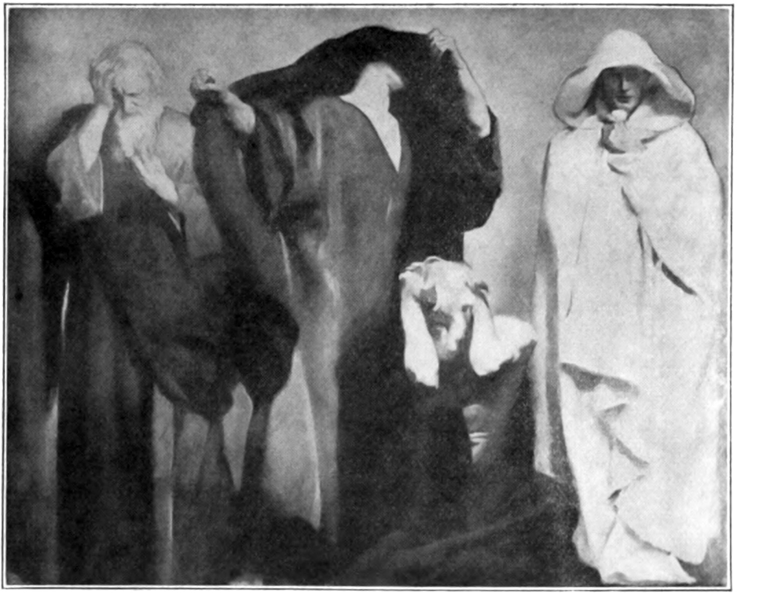 All is gray and dull save the face. This contrast brings out its soft warmth. The dark mass of the curtain with its severely straight vertical lines, contrasted with the darker diagonal mass which represents the figure of the mother, gives us a feeling of solemnity and reverence. The severity of these dark masses is broken by the head and hands. The dainty white cap with its suggestion of lace on the cap strings softens the sweet face and relieves the glossy smoothness of her hair. In her hands she holds a lace handkerchief which we can barely distinguish from the lace on her cuffs. But the hands serve as an exquisite bit of light to lead the eye back to the face, where we study again the calm and tender dignity of the figure and the mysterious beauty of those far-seeing eyes.