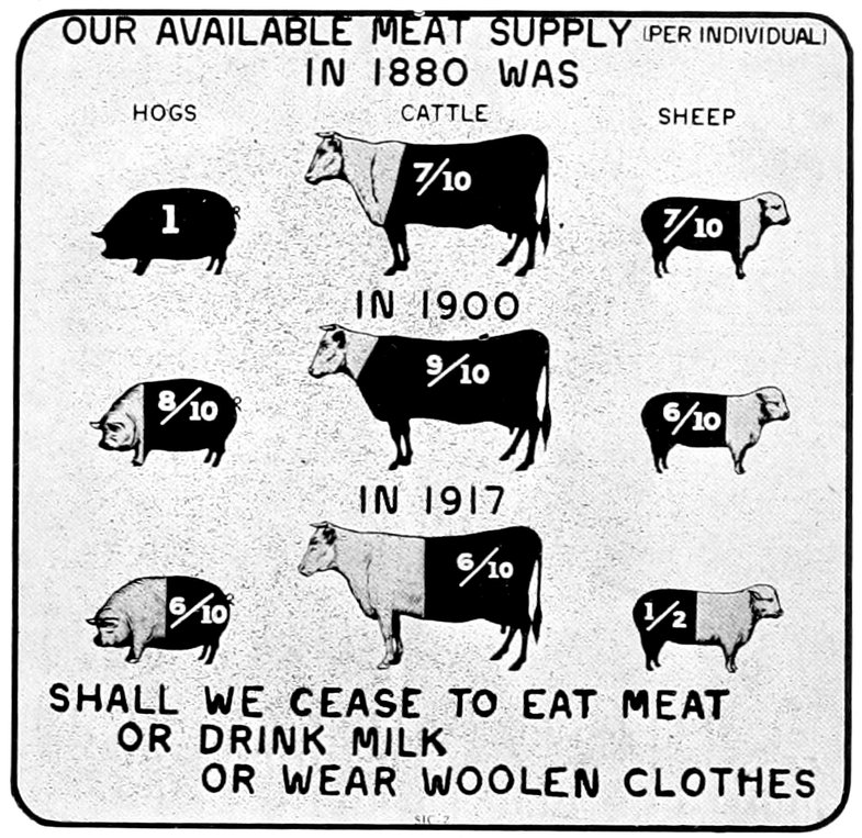 As population increases, land becomes more valuable. As land becomes more valuable—intensive farming is practiced. Grazing becomes virtually impossible under such conditions; and, despite all the efforts of the Department of Agriculture experts, cattle raising is pushed farther and farther from the large centers of population. Increased transportation and costs of refrigeration mean increased meat prices—even the importation of large quantities of South American beef between 1910 and 1914, for instance, failed to keep meat at a price low enough so that it could constitute the large food element which it once was on the American table.