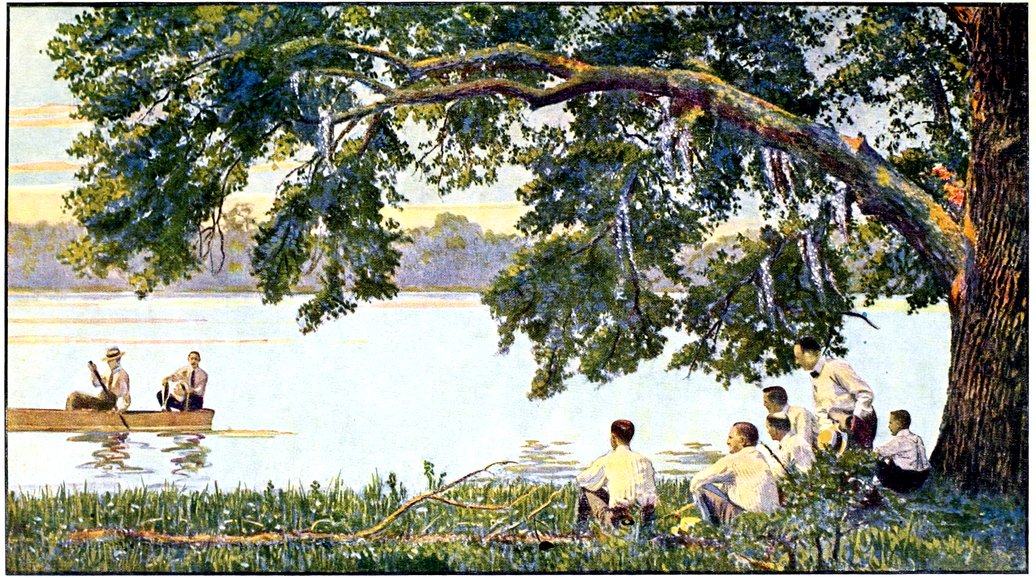 In natural colors from photograph of Lake Marcelia, taken week of June 16, 1919. Note on the large live oak tree at right the beautiful red flowered trumpet vine which wends its way among the glossy green ferns, and further out on the branches the beautiful grayish Spanish moss which stands out so vividly against the luxuriant evergreen leaves of this tree. Mr. Cudabec, orchard unit owner from Denver, Colorado, seated at end of boat, is holding up a fine black bass, measuring a foot in length, which he caught after he rowed but a few rods from the firm, sandy beach which surrounds this lake.