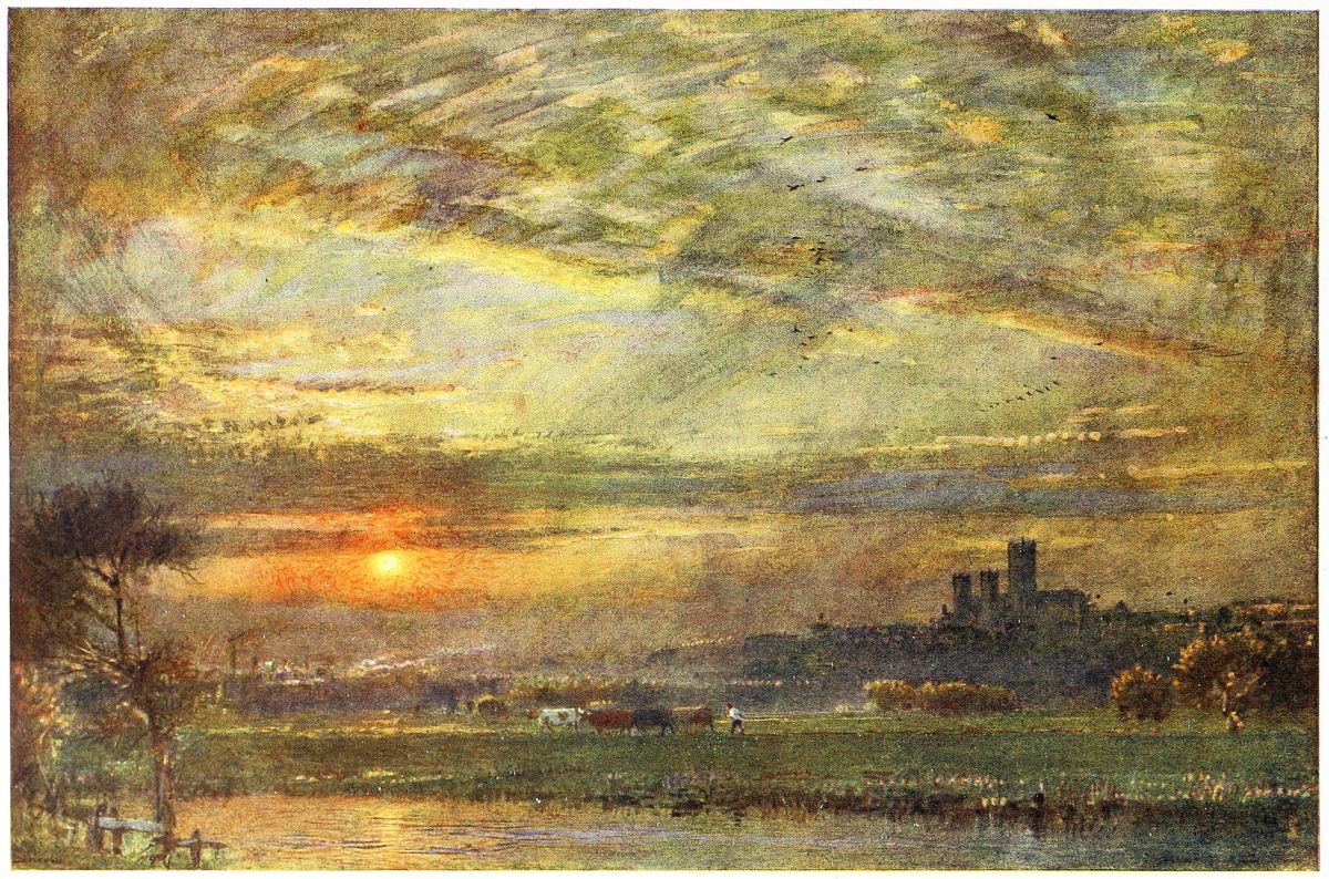 However, in the works of other distinguished living artists, like Matthew Hale, Albert Goodwin—whose Lincoln is here reproduced (Plate VIII), Hughes-Stanton, Lamorna Birch, Wilson Steer, Rich, Gere, etc., we often find a similar use of topographical matter for the purposes of poetical expression, but at the same time they show a marked preference for the choice of subject-matter enriched by historical and literary associations.
