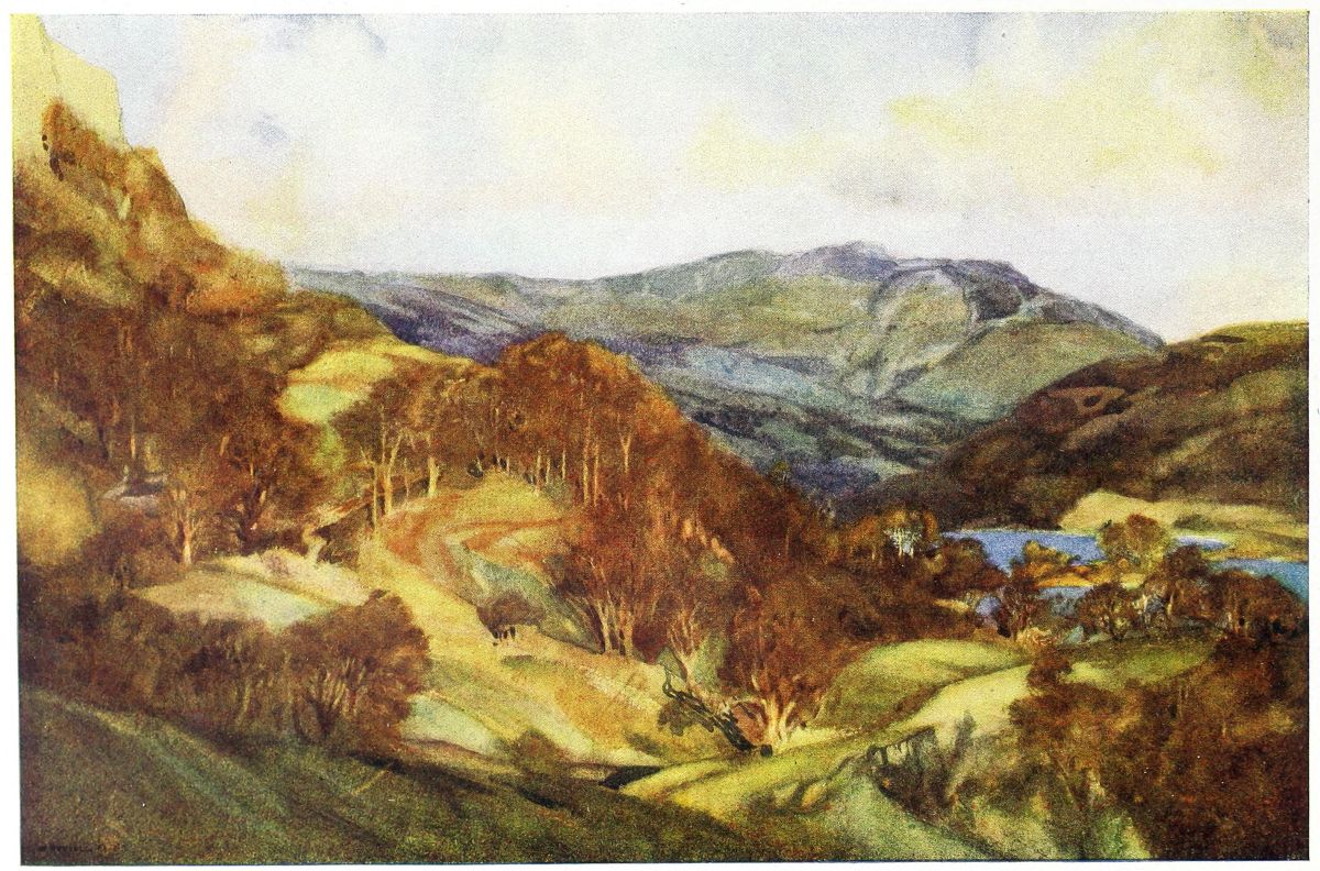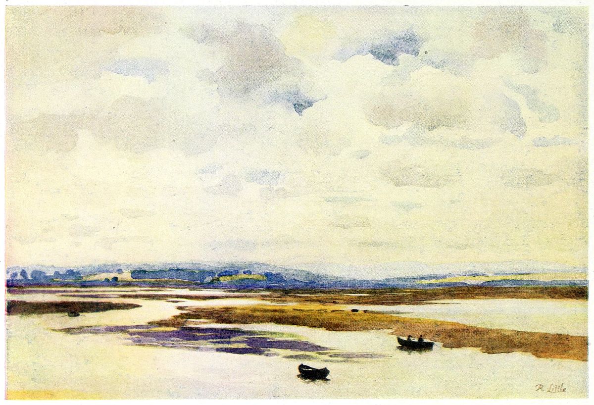 In other cases, generally in the choice of subject-matter, one is often reminded of the works of the older men, only to realize as the result of{28} the comparisons thus provoked the important differences which distinguish the new treatment and justify the repetition of the same motives. Sir Ernest Waterlow’s In Crowhurst Park (Plate XIV), for instance, calls up memories of David Cox, of E. M. Wimperis, Tom Collier and many others who have delighted in such wide surveys of rolling down and moving cloud. But Sir Ernest’s work holds its own against all our historical reminiscences; it is so vivid, so evidently the outcome of the artist’s experiences, so freely and confidently set up. Robert Little’s Tidal Basin, Montrose (Plate X), Lamorna Birch’s Environs of Camborne (Plate V), and Murray Smith’s On the Way to the South Downs (Plate XXII), justify themselves in the same way. How easily, too, can we imagine Girtin or Cozens painting the scene which Russell Flint has portrayed so vividly in his April Evening, Rydal Water (Plate XIX). Yet how differently they would have painted it!