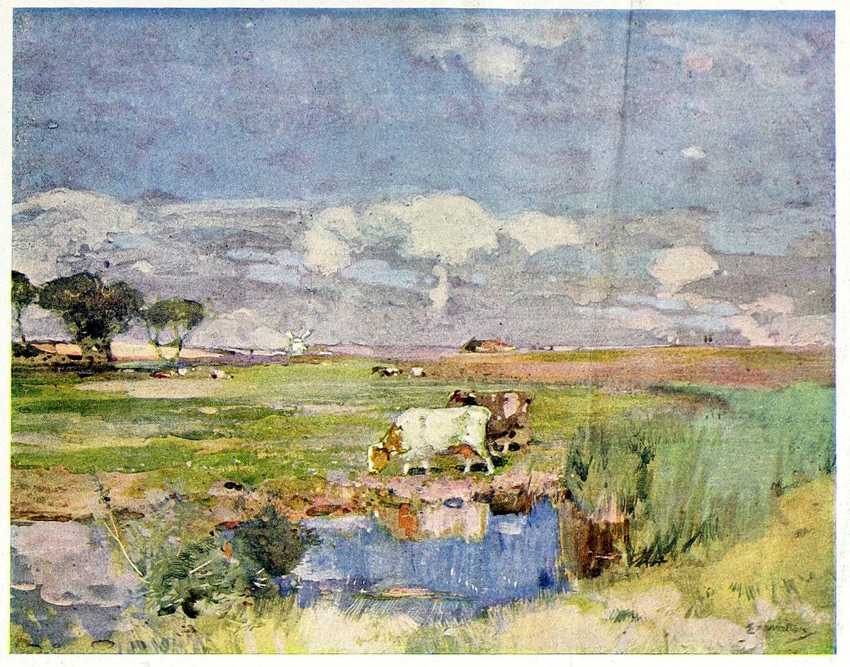 With the exception of the work of De Wint and Cox, the greatest influence recognizable in the work of many of the Scottish water-colourists is of Dutch origin and easily traced to such masters as Anton Mauve, Josef Israëls, Bosboom and the Maris brothers; so much so in fact that with certain artists it has been difficult to discern the difference between many of their own paintings and those of the men by whom they were so obviously inspired. The method employed was as follows: after the drawing had been roughly suggested, the paper was submitted to a tubbing and scrubbing, so that the colour ate its way in until finally more direct and stronger touches were applied, desired lighter portions being wiped out while wet, or slicked up with a little body-colour. The method, though losing much that is inherently beautiful in water-colour, is nevertheless one which most aptly suggests certain phases of landscape dealing with poetic sentiment and mystery.