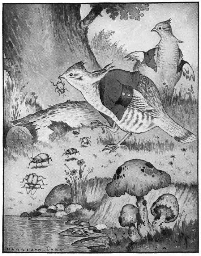 A big handsome grouse had joined them now. It was old Thunderer, and sometimes when he would throw back his head, spread his beautiful tail until it was like a fan, raise the crest on his head and the glossy ruff on his neck, and proudly strut ahead of them, Tommy thought him the most beautiful sight in all the world and wondered if ever he would grow to be half as handsome. While he did little work in the care of the brood, Thunderer was of real help to Mother Grouse in guarding the little[39] family from ever-lurking dangers. There was no eye or ear more keen than his, and none more skillful than he in confusing and baffling a hungry enemy who had chanced to discover the presence of the little family. Tommy watched him every minute he could spare from the ever important business of filling his crop, and stored up for future need the things he learned.