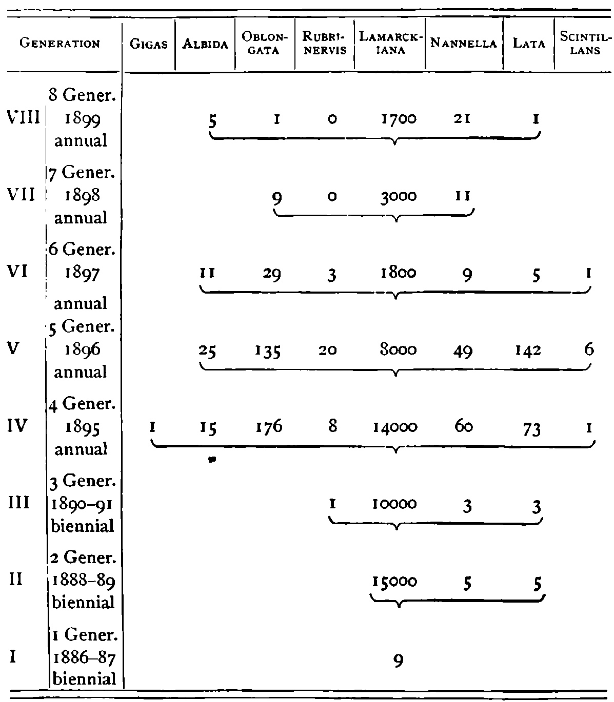 The attacks on the Darwinian school by the followers of the modern school of experimentalists are with few exceptions based on the assumption that the natural selectionists pretend that their principle is a sort of creative force,—a factor in evolution in the sense of being an active agent. This assumption of the selectionists has led many of them to ignore a fundamental weakness of their theory, namely, the origin of the variations themselves, although Darwin did not overlook or ignore this side of the problem, or fail to realize its importance, as have some of his more ardent, but less critical, followers. They have contented themselves, as a rule, with pointing out that certain structures are useful, and this has seemed to them sufficient proof that the structures must have been acquired because of their value. In contrast to this complacency of the selectionists, we find here and there naturalists who have, from time to time, insisted that the scientific problem of evolution is not to be found in the principle of selection, but in the origin of the variations themselves. It will be clear, from what has been said, that this is our position also, and for us adaptation itself does not appear to be any more a problem that can be examined by scientific methods, than the lack of adaptation. The causes of the change of whatever kind should be our immediate quest. The destruction of the unfit, because they can find no place where they can exist, does not explain the origin of the fit.