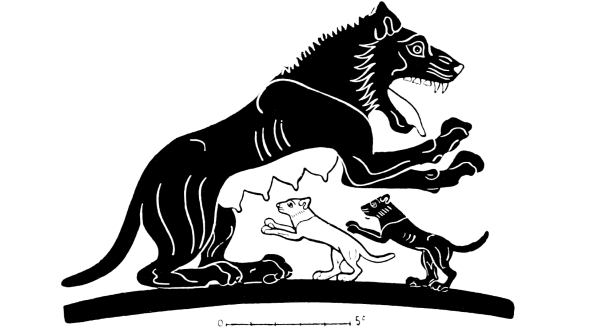 Fig. 1. Lioness and young from an Ionian vase of the sixth century b. c. found at Caere in Southern Etruria (Louvre, Salle E, No. 298), from Le Dessin des Animaux en Grèce d’après les vases peints, by J. Morin, Paris (Renouard), 1911. The animal is drawing itself up to attack its hunters. The scanty mane, the form of the paws, the udders, and the dentition are all heavily though accurately represented.