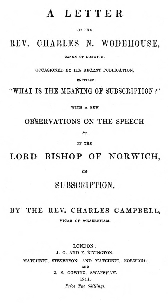 I shall now proceed to hazard a few observations on the reasons assigned by the Bishop of Norwich in favour of an Expansion of Subscription, seeing that they are considered by many so strongly to confirm the correctness of your own views, and as you have told us that you cannot consistently with truth and honesty make the required Subscription, we cannot but apprehend that in the proportion that those views are believed to be substantial and correct, the character of the clergy must be prejudiced, at all events in the eyes of those, who unwilling or unable to investigate the matter for themselves, take up the opinions of others, and arriving through them at a corollary of their own, hesitate not to go as far as to declare that “all the clergy are perjured.”