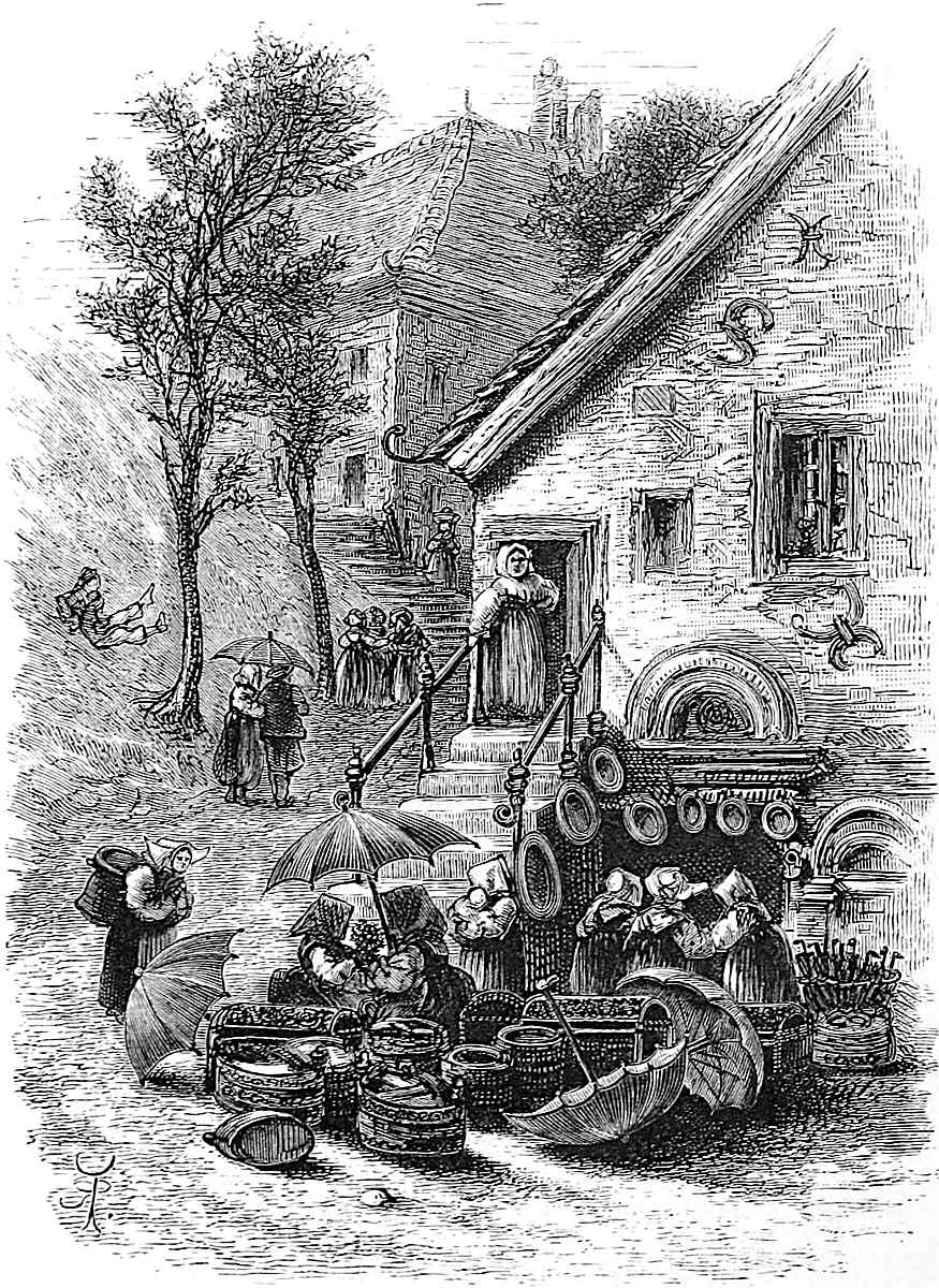Funerals in this country take many forms. First, in towns, for plump, portly burghers, as well as for men of note in letters, politics, or art, there is the old form of coffin chariot, with cock-hatted driver, the horses clothed in all the panoply of funereal darkness, the road sprinkled with juniper or yew twigs, the Death’s head blended with a flame rising from the urn as decoration; the latter the only cheerful, hopeful thought in the whole arrangement. We regret to add that, like weddings, funerals are characterized by heavy libations. As to military obsequies, they are much the same in all lands, and therefore we need say nothing concerning them. And now, away from towns and cemeteries, to the more simple method of taking farewell of passing spirits and lifeless clay.
