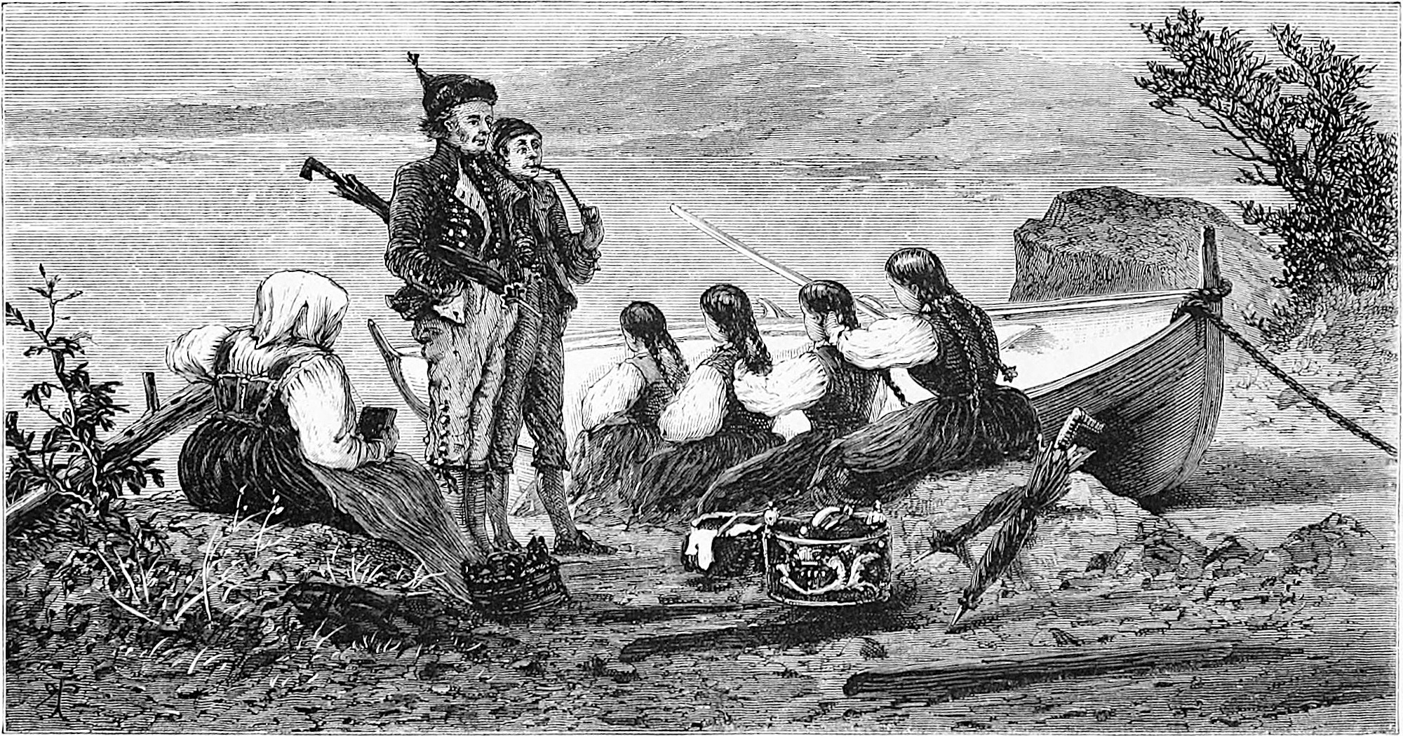 The picturesque group at the altar of the church takes one back to the Middle Ages: the bride resplendent in costume—in some cases quaint to a degree, especially in Sætersdalen—with the old silver brooches, rings, and pendants of generations long gathered to their fathers; the bridegroom also, most likely, in costume, with his best man close by to look after the bridesmaid; in the centre, the Elizabethan ruff, pure white as in Queen Elizabeth’s time, thrown vigorously up by the sombre black gown, renders the priest a prominent figure; while perhaps a ray from the sun, descending on the group, shines upon the bride at the very moment when that ray only 193is wanted to complete the pictorial effect of the grouping and its surroundings. The verger, or clerk, with his long red pole—the functionary described in a former chapter—is not on active service to-day to awake the sleepers; in fact, the congregation seems rather inclined to turn the tables and wake him up. The church floor is, as usual, strewn with juniper tips, and after the ceremony the bride and bridegroom start home. Walk, ride, drive, or boat—that depends on the distance and character of the road to be traversed. They are all picturesque: the water, however, carries the palm, and, as we have before remarked, the whole scene causes one to revert to early days, before carriages were used, or roads were uninviting for travel, and when locomotion was a difficulty.