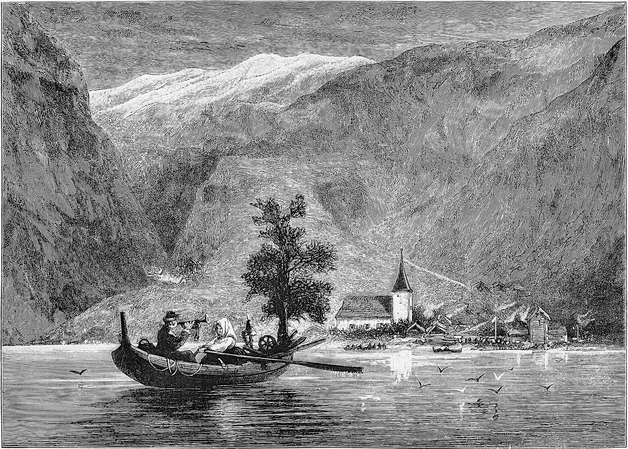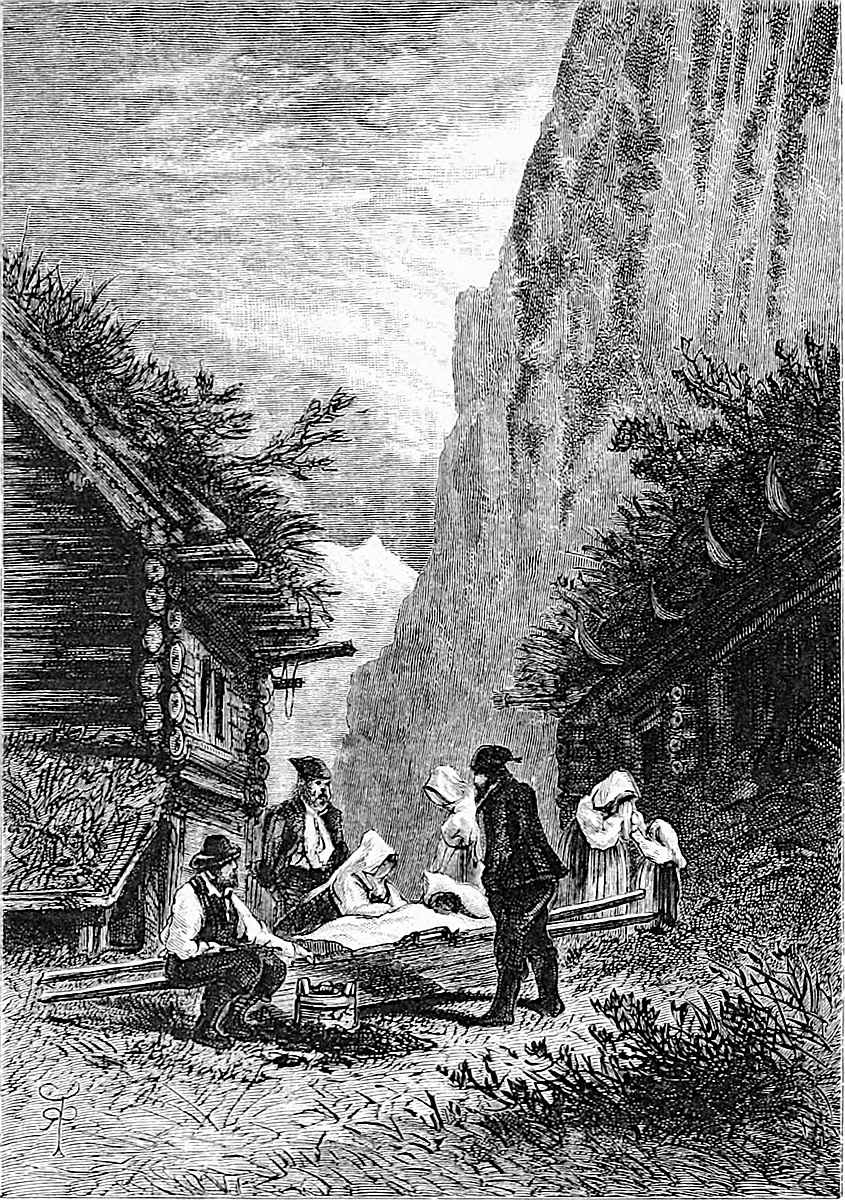 A Norwegian funeral is surrounded by an unwholesome atmosphere of intense melancholy; hope and faith seem trampled down for the moment by the weight of present grief. The Norwegians certainly do not look upon 199the arrival of the reaper who puts in the sickle as the “order of release” from the trammels of our lower state. Perhaps their intensity of feeling is a certain relief from which they rebound to a lighter burden in after-life. Their quiet, secluded life encourages this; the very sombreness of the 200country develops it; and the almost oppressive grandeur of the scenery sustains it; while the absence of birds with joyous song certainly adds to it.
