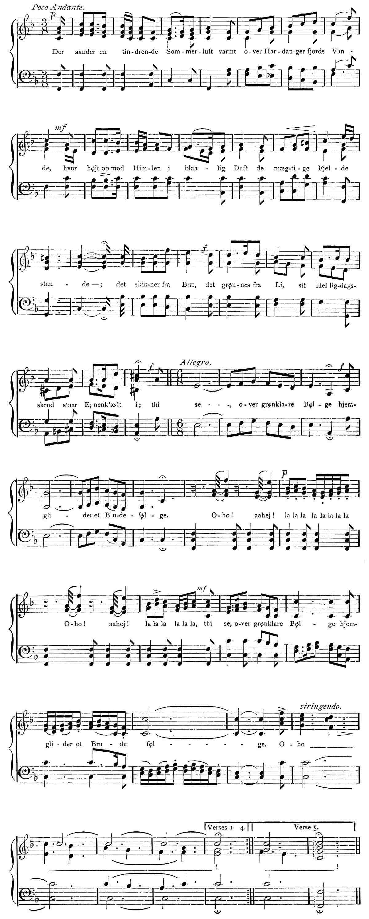 To visit Oscar’s Hall the most pleasant way is to take a boat and row across. This was suggested by Hans, and we were glad to find that he took kindly to boat work, as he came from Gudbransdalen, which is inland. More pleased, however, were we to discover, when about half-way across, that Hans was gradually bursting out into song, singing in a clear voice one of Kjerulf’s sweetest compositions, which we give in part at the end of the chapter. There is a plaintive sweetness throughout it, and the beauty of the evening, coupled with the surprise, caused us to anticipate 13many future repetitions, as nothing, when travelling, is more humanising and soothing than vocal or instrumental music.
